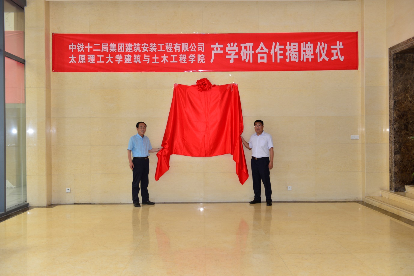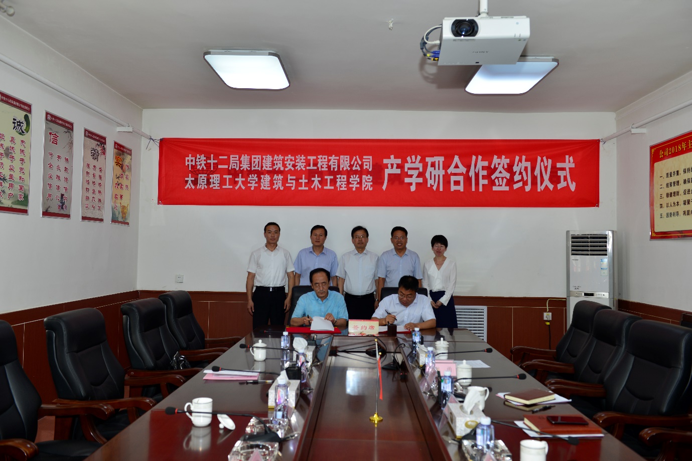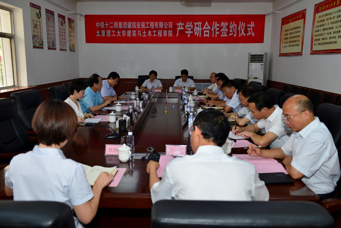 2018年7月8日上午10点,永利yl23411建筑与永利yl23411与中铁十二局集团建筑安装工程有限公司在建安公司会议室举行产学研合作框架协议签署仪式及产学研合作揭牌仪式。建筑与土木工工程学院经理雷宏刚教授、土木系主任董晓强教授、土木实验中心主任刘元珍教授,中铁十二局集团建筑安装工程有限公司董事长、总经理蔡英康、党委书记姜振生、公司副总经理、总工程师王中军、副总经理卢会永、副总工盖宏、副总工解明旭、副总经济师李勇、科技部副部长范伟、科技部副部长王美静、测试中心副主任王欢、科技部部员杜莎莎出席了签约及揭牌仪式。