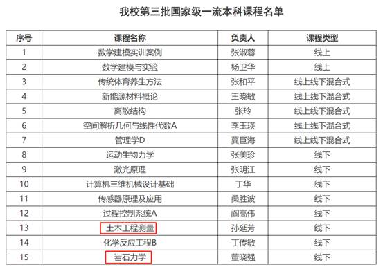 近日,教育部高等教育司发布了《关于第三批国家级一流本科课程认定结果的公示》,公司《岩石力学》(负责人:董晓强)与《土木工程测量》(负责人:孙延芳)两门课程获批国家级一流本科课程,为学院本科教学高质量发展再添亮眼成绩!