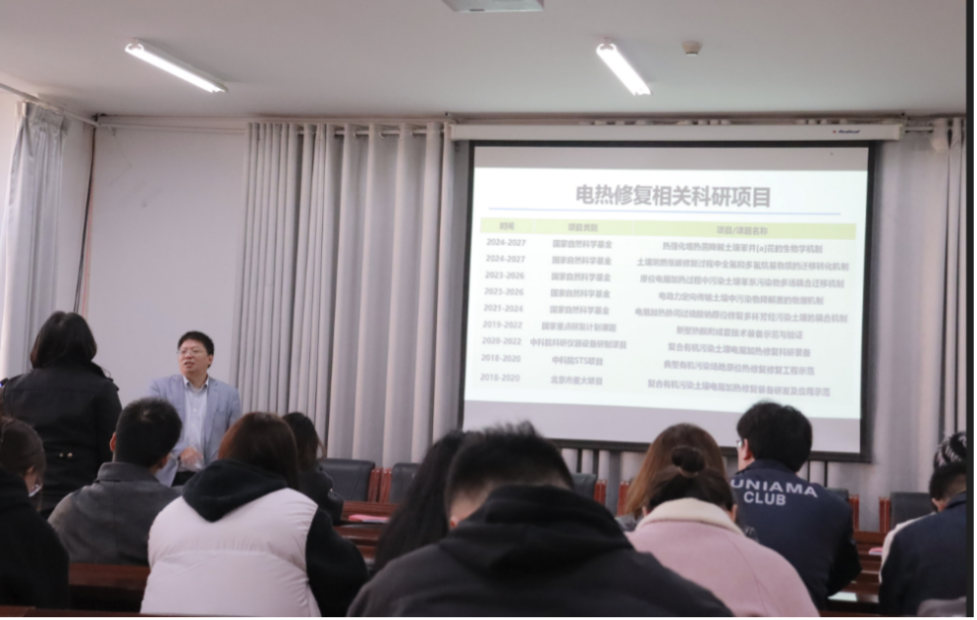 焦文涛研究员与参会师生就科研中遇到的问题、国家自然科学基金选题等进行了深入交流。报告现场学术氛围浓厚,增强了大家对土壤热修复技术、科研以及科学问题的认识和理解。最后,焦文涛研究员与参会师生进行了合影留念。