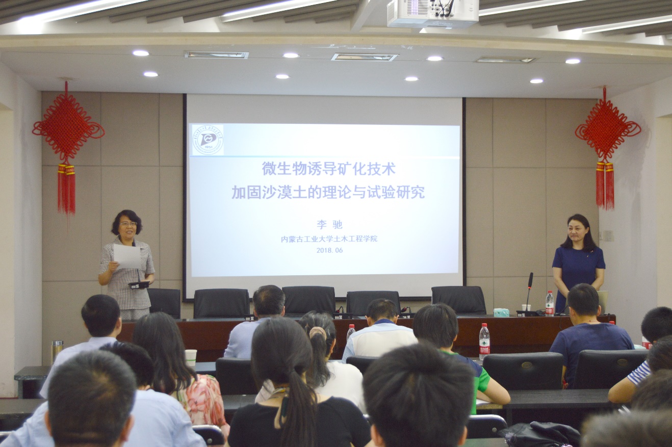 应公司岩土工程学科的邀请,内蒙古工业大学李驰教授于2018年6月2日来校交流,上午作为答辩委员会主席参加了博士研究生张苇同学的学位论文答辩会,下午在博学馆五层会议室做了题为“微生物诱导技术加固沙漠土的理论与试验研究”的学术报告,报告会由白晓红教授主持,岩土与地下工程研究所、建筑材料与防灾研究所和建筑节能与新材料研究所师生聆听了此次报告。
