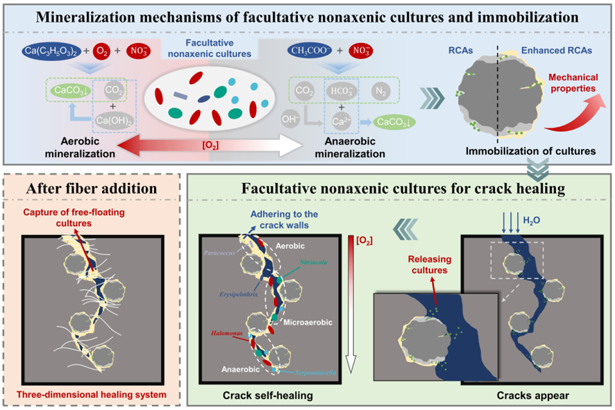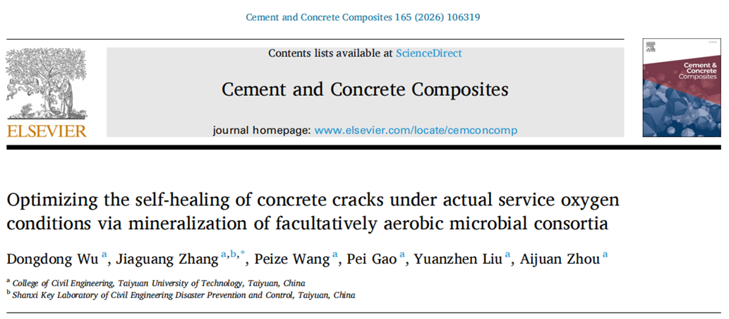 近日,公司2023级硕士研究生武栋栋在导师张家广教授的指导下,以第一作者身份在建筑材料领域国际顶级期刊《Cement and Concrete Composites》(中科院1区TOP, IF=13.1)上发表了题为“Optimizing the self-healing of concrete cracks under actual service oxygen conditions via mineralization of facultatively aerobic microbial consortia” 的研究论文。该论文由武栋栋担任第一作者,张家广教授为通讯作者,绿色建筑技术与综合防灾研究团队刘元珍教授和污染物定向转化与资源化利用团队周爱娟教授等作为共同作者完成。论文第一署名单位及通信作者单位均为永利yl23411。