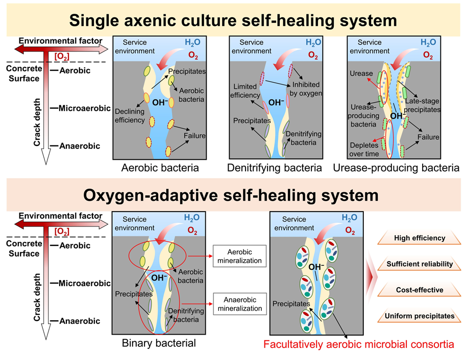 图3. 基于氧气适应型微生物基修复剂的混凝土裂缝自修复原理