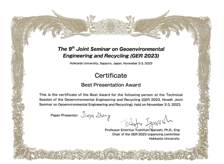 学术报告闭幕式上,大会学术委员会经投票评选出了研究生最佳报告奖,张洁雅喜获殊荣。同时,大会宣布由公司承办第十届环境岩土工程与循环利用国际研讨会,董晓强介绍了校院的基本情况和学科发展现状,向大会组委会的信任表示了感谢,诚挚邀请大家2024年相聚永利yl23411。