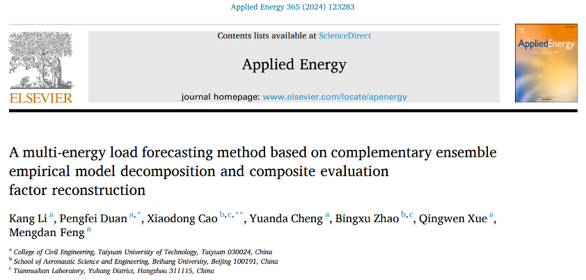 近日,公司2022级硕士研究生李康在国际知名期刊《Applied Energy》发表了题为《A multi-energy load forecasting method based on complementary ensemble empirical model decomposition and composite evaluation factor reconstruction》的研究论文,李康为第一作者、导师段鹏飞为通讯作者,建筑环境控制与可持续能源应用团队程远达、薛庆雯等为共同作者,永利yl23411为第一作者单位。