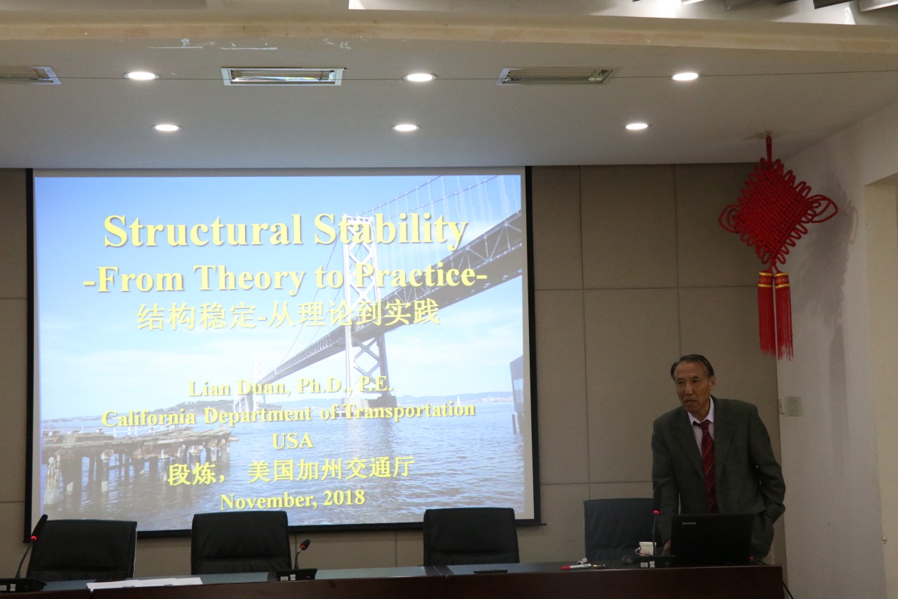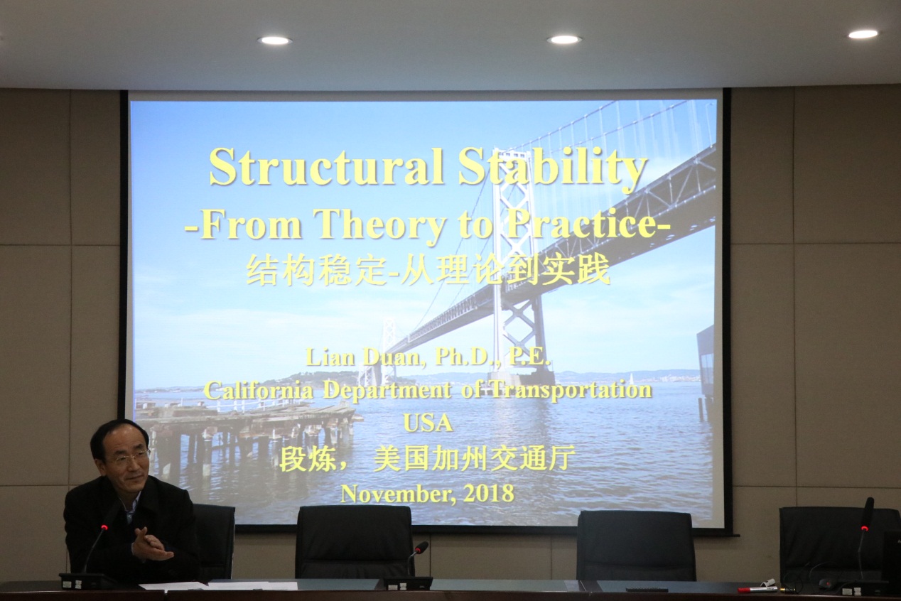 应建工学院的邀请,美国加里福尼州交通厅钢结构委员会主席、资深桥梁工程师段炼于2018年11月7日到访公司,在博学馆五层报告厅做了主题为“结构稳定——从理论到实践”的学术报告,由雷宏刚经理主持,土木系师生100余人聆听了此次报告会。