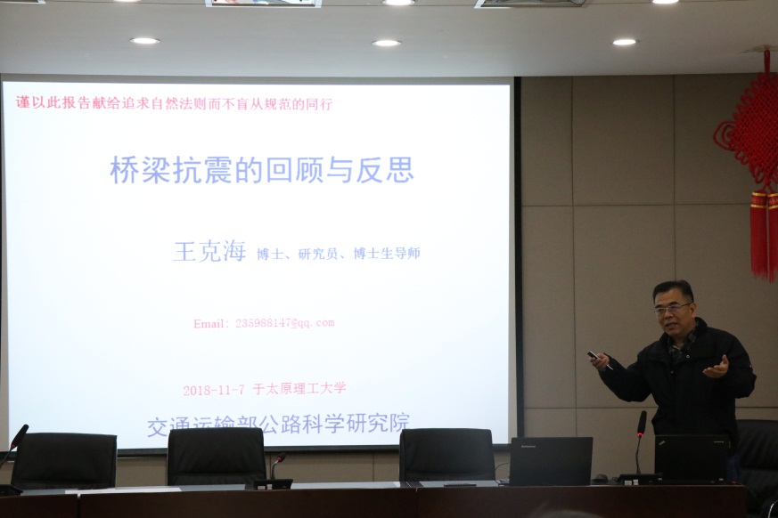 应建工学院的邀请,国家减灾委专家王克海于2018年11月7日到访公司,在博学馆五层报告厅做了主题为“桥梁抗震的现状与展望”的学术报告,由雷宏刚经理主持,土木系师生100余人聆听了此次报告会。