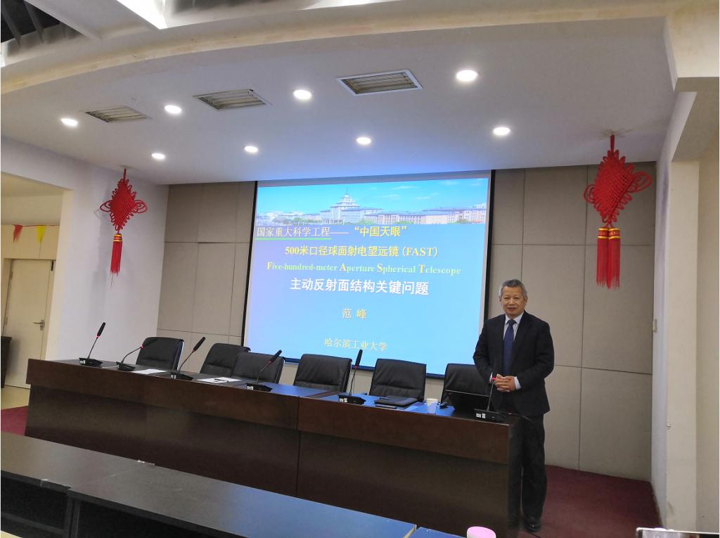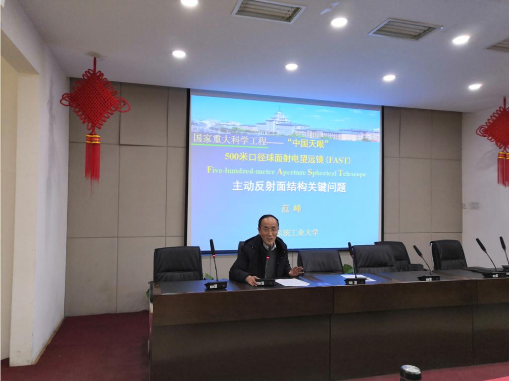 随后,范锋教授做了题为“500米口径球面射电望远镜(FAST)——主动反射面结构关键问题”的学术报告。范教授首先介绍了国内外望远镜的发展背景,引出我国建立500米口径球面射电望远镜的重要性及必要性。随后对500米口径球面射电望远镜主动反射面结构进行了详细的介绍。主要内容包括:FAST主动反射面结构总体方案、反射面结构关键技术及反射面结构30m模型试验。重点阐述了主动反射面结构关键问题及其技术方案。每部分内容都从问题引出 — 方案对比 — 结果分析三方面进行系统深入地讲解。最后,范教授指出,FAST主动反射面结构研究所获得的技术创新成果为国家重大科学工程FAST国家立项和工程实施提供了坚实基础,同时也展示了土木工程研究更广阔的天地。