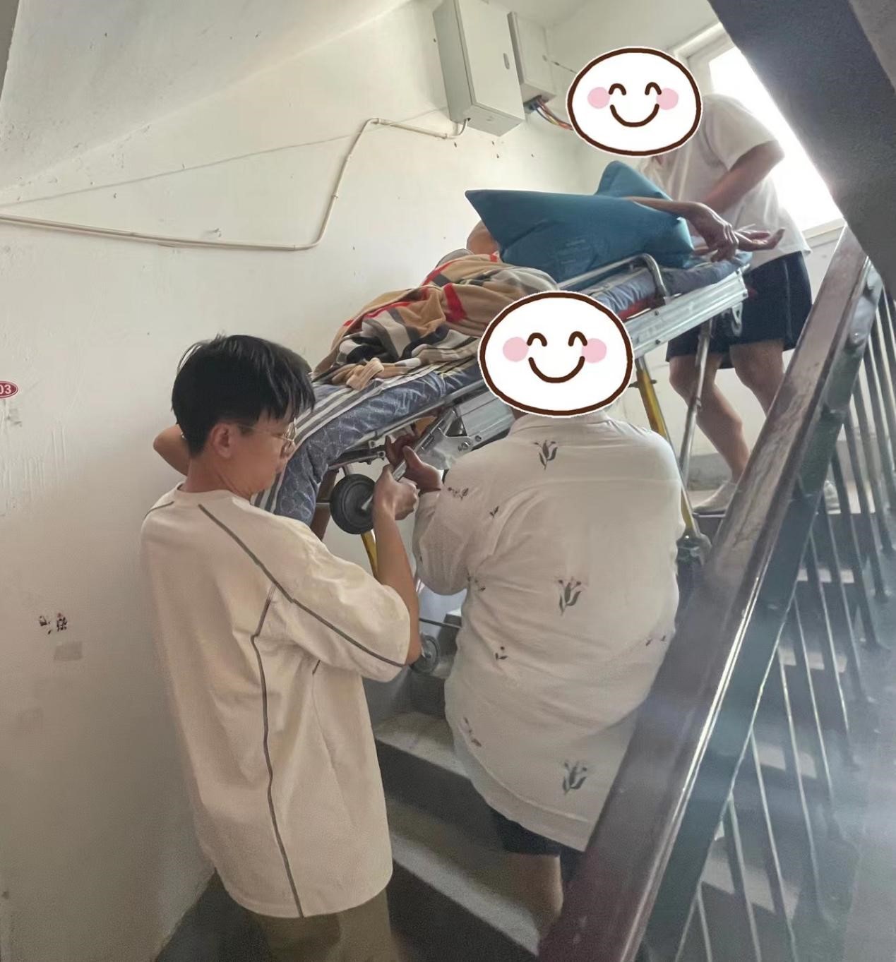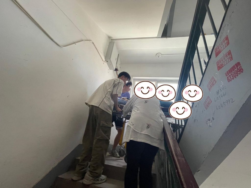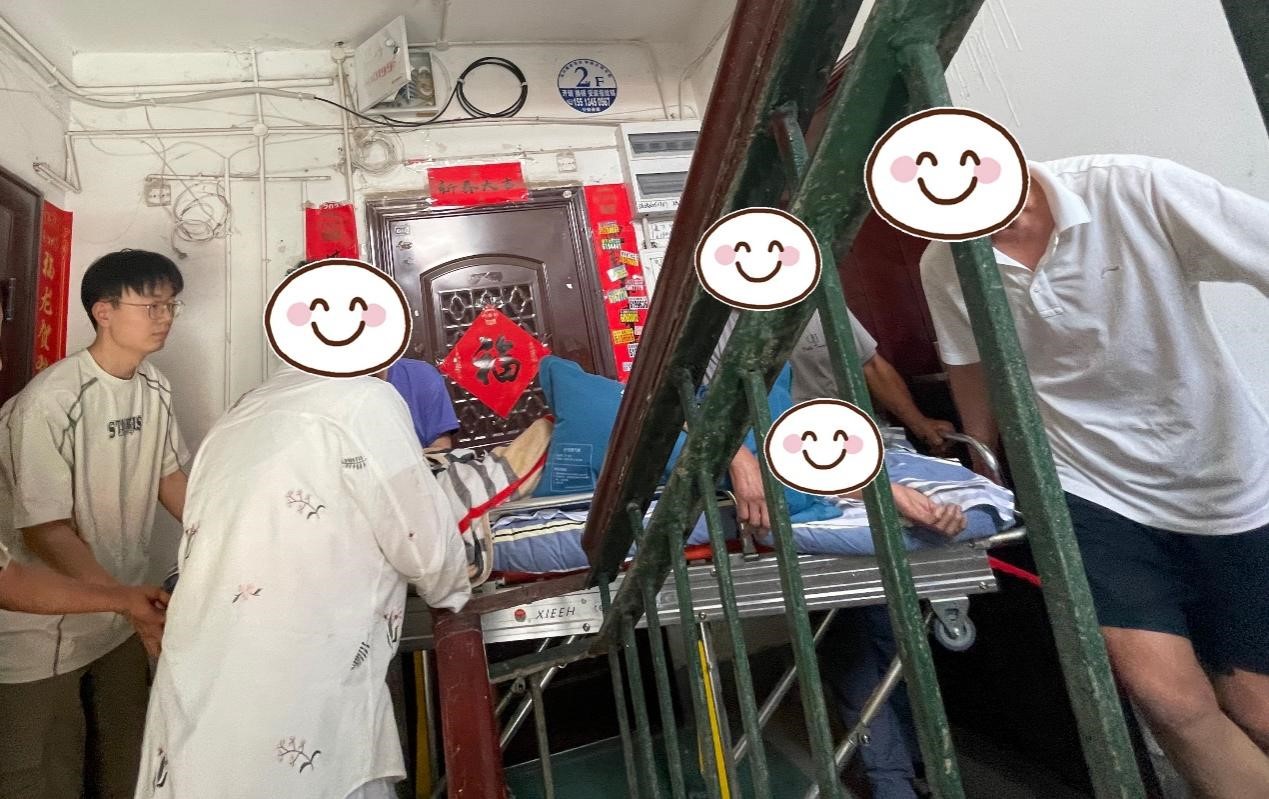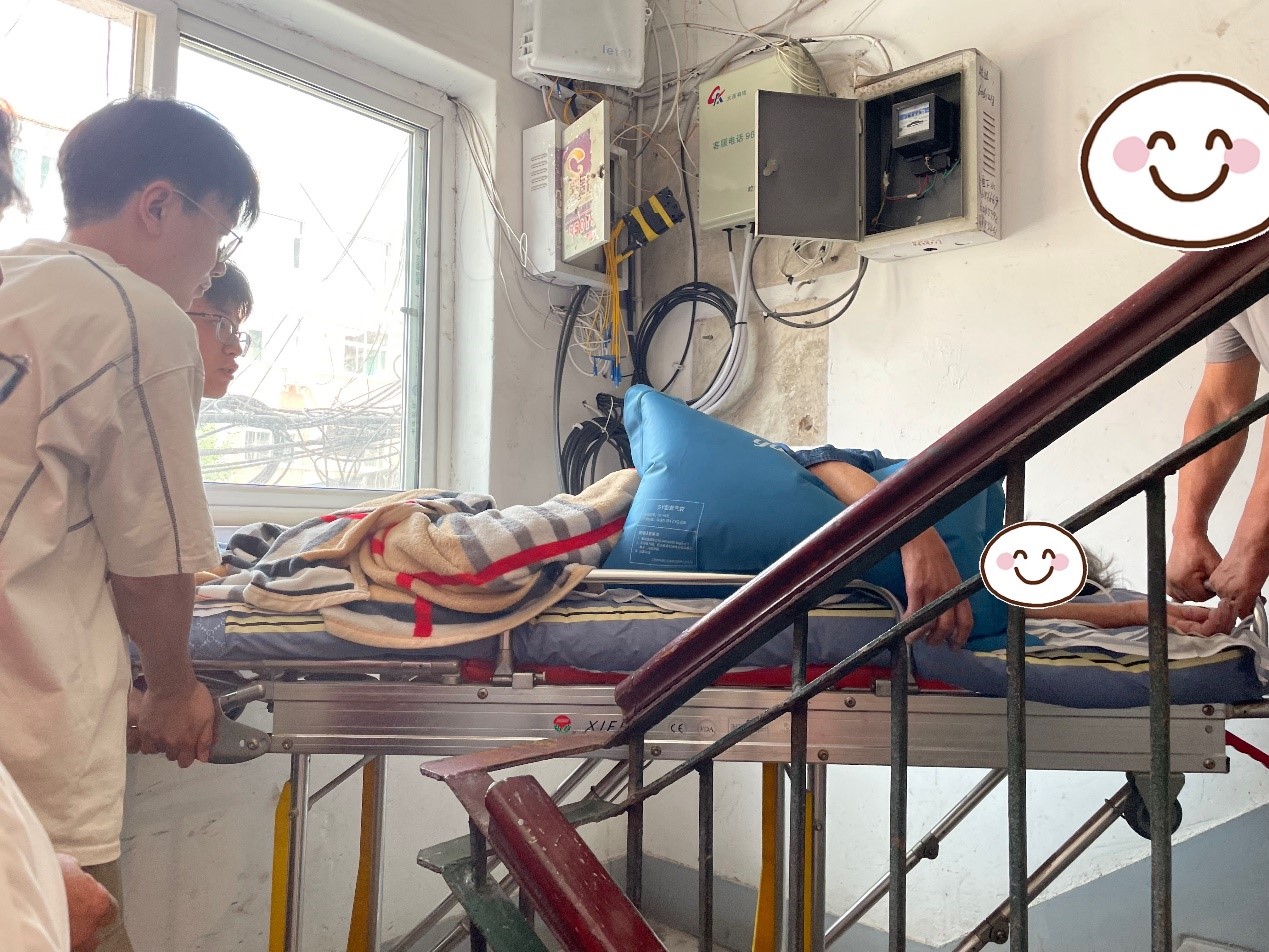 2024年6月13日中午11点半,土木第一研究生党支部书记柳丽接到一名永利yl23411教职工的求助信息,对方称其居住在永利yl23411西院住宅小区无电梯的住宅楼4楼,其家属中午12点将从医院治疗出院归来,但由于行动不便依旧卧于担架车上,而其他男性亲友有事无法前来,该名教职工及女性家属将出院家属抬上楼存在困难,所以希望能得到志愿者的帮助。柳丽同志在了解具体情况后,随即号召支部张鹏昆、曹培格、岳中华、张凯4名党员,积极承担抬担架助群众回家的“伸出援手,照亮他人”志愿服务,大家没来得及吃午饭便前往永利yl23411西院住宅小区进行帮忙。