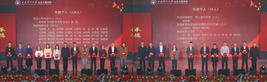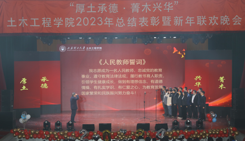 芦倩宣读了表彰决定及名单。在过去的一年里,全体土木人围绕学校的发展目标和员工综合培养的要求,砥砺耕耘,不懈奋斗,在思想引领、国际交流、人才培育、科学研究、社会服务等方面涌现出一批先进代表,为学院发展注入动能,凝聚合力。为表彰先进,树立典型,总结经验,晚会现场举办了颁奖仪式,与会领导为获奖师生代表颁发荣誉证书。葛忻声带领新入职教职工进行了集体宣誓。