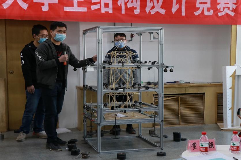 比赛采用提交计算书,理论方案的现场陈述与答辩,模型实际承载能力表现的形式。为了保障疫情防控安全需求,工作人员提前将参赛队伍比赛时间分开,每支队伍提前20分钟到现场进行模型安装准备,最大限度地减少了人员聚集。模型加载能力表现由模型加载装置进行三级承重评价,按照国赛赛题评分细则进行打分,现场计算最终得分,评委现场评价模型的创新性和不足之处。经过一整天紧张激烈地比拼,从37组提交实物模型的最终决出6组队伍参加下一轮选拔比赛。本届大赛虽然受到了新冠肺炎疫情的影响,但是公司精心组织,积极动员,参赛队伍再创新高,模型制作水平较往年得到明显提升。