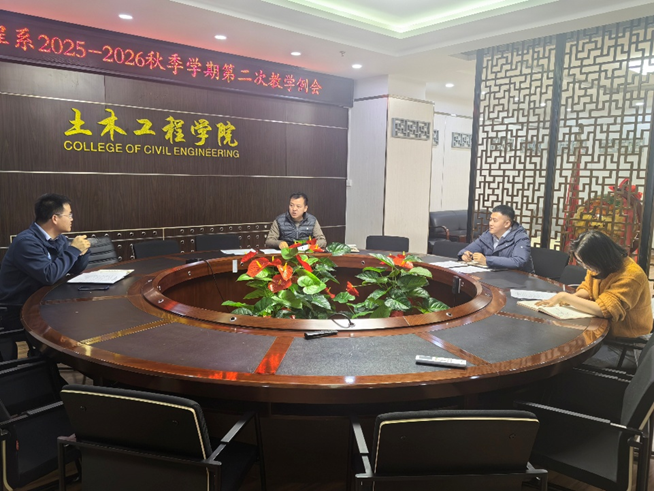 2025年10月23日上午9:00,建筑工程系在学院二层会议室召开本学期第二次本科教学例会,副主任何斌,施工教研室主任王亮、结构教研室主任邱斌和岩土工程教研室副主任刘晓凤参加,例会由何斌主持。