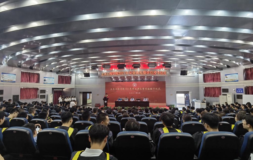 The graduation ceremony kicked off with the inspiring national anthem of the People's Republic of China. Afterwards, Zhou Wei announced the list of 2021 outstanding graduats of the College of Civil Engineering and presented awards to them. Ge Xinsheng informed the employment situation of our 2021 graduates. Du Zhenyu announced the results of the 2021 undergraduate graduation project (thesis) selection.