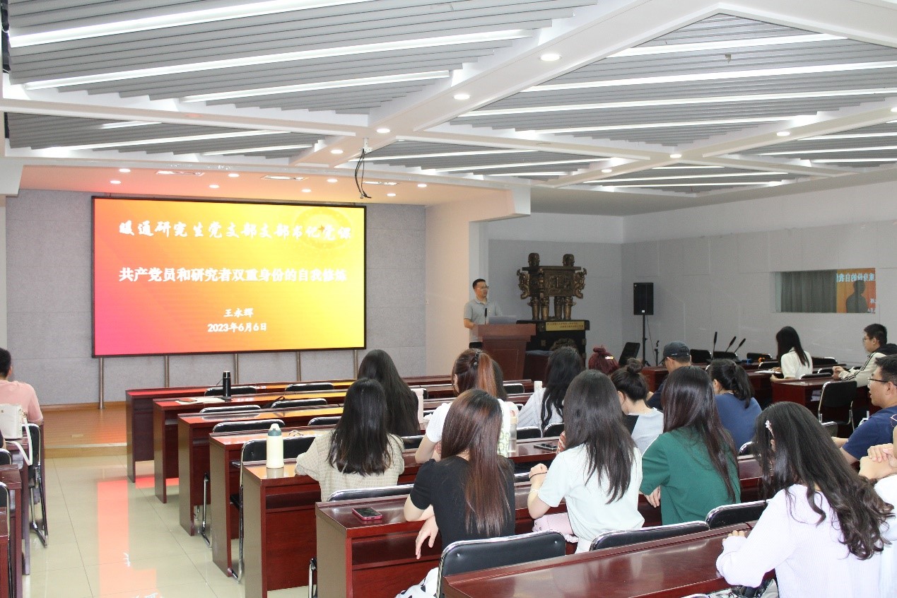 会上,党支部书记王永辉以“共产党员和研究者双重身份的自我修炼”为题开展党课,主要讲述了自我修炼的必要性、共产党员的党性修炼、研究者的能力和品质、以及两种自我修炼的结合,结合我党的发展历程和当今世界格局,对共产党员的政治修养、理论修养、作风修养、道德修养、能力修养分别作出解释。要求全体党员同志们,坚决做到“两个维护”、学懂弄通习近平新时代中国特色社会主义思想、严守党的纪律、坚决抵制形式主义、官僚主义。号召研究生党员提升自身的研究能力和品质,以辩证法和逻辑思维来构建自己的党性修炼观,成体系的学习党史、党章等知识,要精读、读懂、读透。