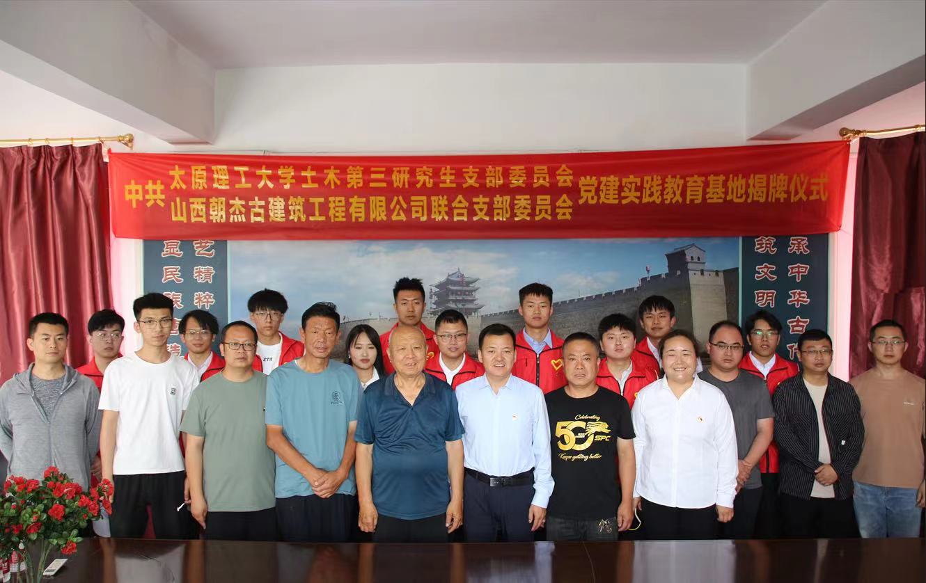 在活动仪式上,土木第三研究生党支部书记何斌与山西朝杰古建筑工程有限公司联合党支部书记王照共同签署了党组织结对共建协议;支部书记何斌和副书记马富丽及公司联合党支部书记和公司总经理王国和共同为党建实践教育基地揭牌。