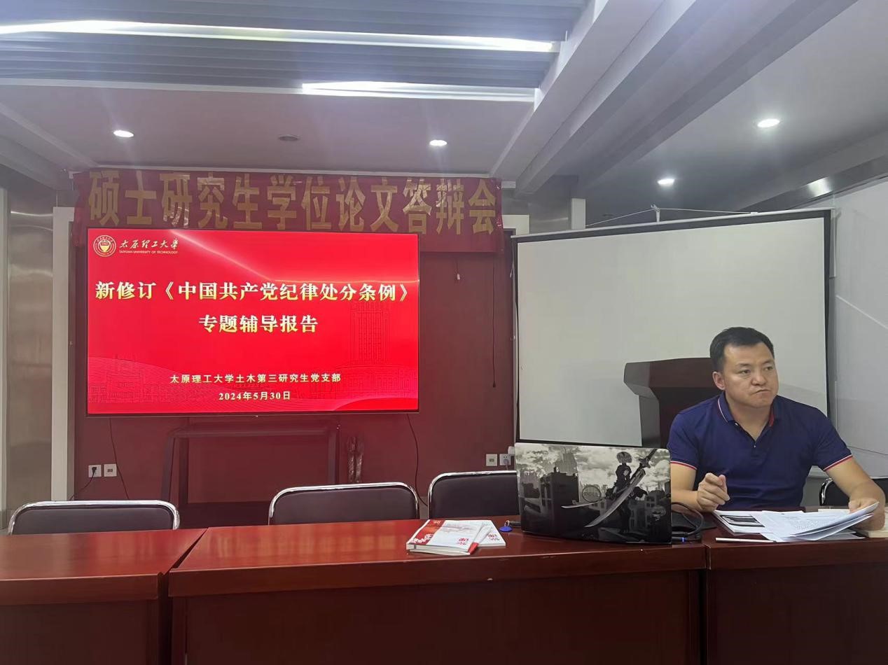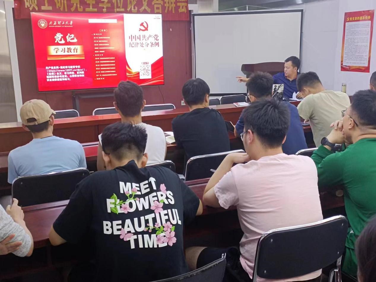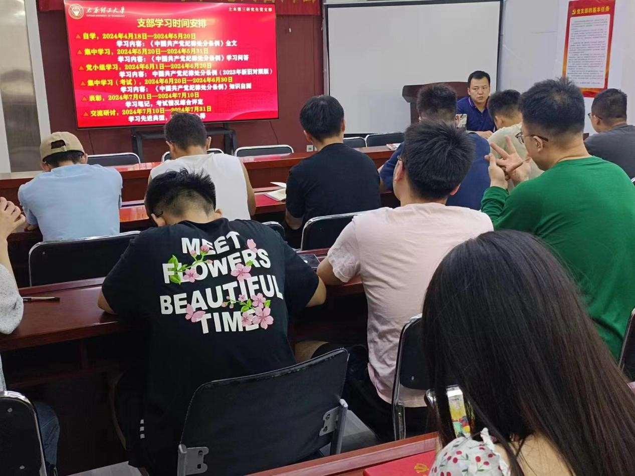 最后,何斌书记为进一步加强党纪学习教育对研究生党员进一步深入开展党纪学习教育提了三点要求。一是要在深化认识上下功夫,研究生党员要认真学习习近平总书记关于党纪学习教育的最新讲话要求,以更高标准学好用好党纪处分条例。二是要在笃学力行上下功夫,树标杆、做表率,把党纪学习教育进一步引向深入。三是要把开展党纪学习教育与土木第三研究生党支部“5321”工作模式紧密结合,与支部年度重点工作紧密结合,使党纪学习教育成为促进支部高质量发展的有效举措,确保党纪学习教育取得实效。