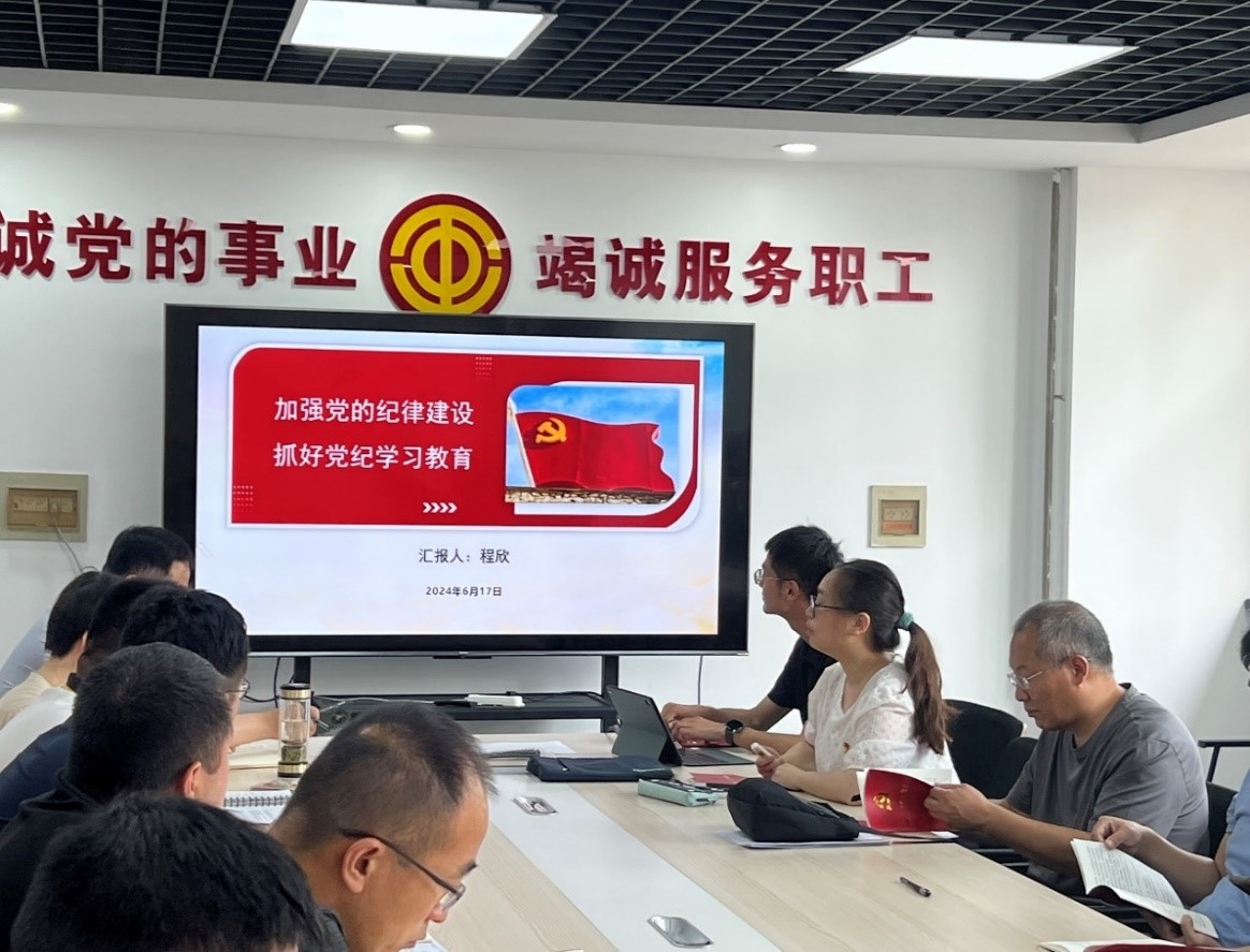 在学习研讨环节,程欣书记首先强调了“三会一课”的重要性,并以“加强党的纪律建设,抓好党纪学习教育”为题讲授了党纪学习教育专题党课。她系统讲解了党纪学习教育的背景意义、主要内容和路径方法,深化了支部党员对党纪党规的理解和认识。